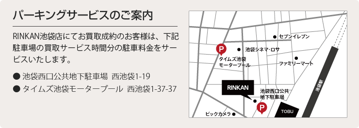 国道254号線(川越街道)や東京都道317号環状六号線などでアクセスいただけます。近隣に駐車場も多数あり、池袋西口公共地下駐車場(池袋西口都市計画公共地下駐車場)、タイムズ池袋モータープールでしたら、RINKAN池袋店にてお買取成約で、買取サービス時間分の駐車代をサービスいたします。