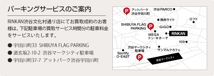 首都高速3号渋谷線の渋谷出口、国道246号渋谷駅西口交差点を左折して約5分。駐車場は、SHIBUYA FLAG PARKING、渋谷マークシティ駐車場、アットパーク渋谷宇田川町をご利用の場合、RINKAN渋谷文化村通り店にてお買取成約で、買取サービス時間分の駐車代をサービスいたします。