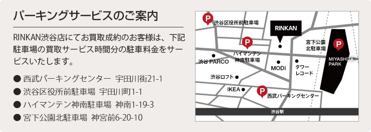 首都高速3号渋谷線の渋谷出口、国道246号渋谷駅西口交差点を左折して約5分。RINKAN渋谷店の近隣には、西武パーキングセンター、渋谷区役所前公共駐車場、ハイマンテン神南駐車場などコインパーキング、宮下公園北駐車場などあり、RINKAN渋谷店にてお買取成約で、買取サービス時間分の駐車代をサービスいたします。
