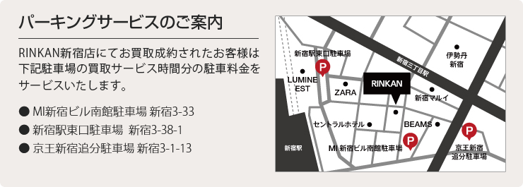 新宿三丁目で交わる新宿通りや明治通り、甲州街道からわずか3分。近隣にはMI新宿ビル南館駐車場、新宿東口駐車場や伊勢丹パーキング、京王新宿追分駐車場などの駐車場もあり、RINKAN新宿店にてお買取成約で、買取サービス時間分の駐車代をサービスいたします。