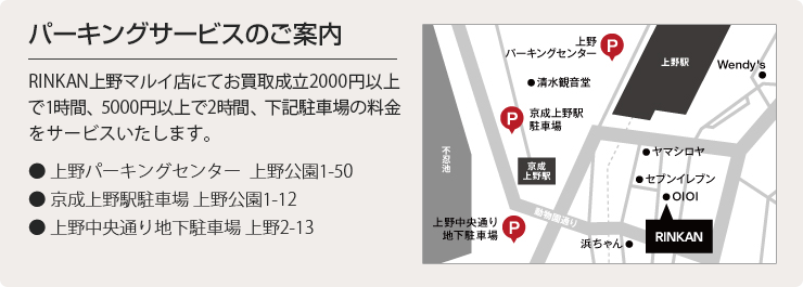 国道4号、17号、6号などからアクセス可能。上野パーキングセンター、京成上野駅駐車場、上野中央通り下駐車場をご利用の場合、RINKAN上野マルイ店にてお買取成約2千円以上で1時間、5千円以上で2時間分の駐車代をサービスいたします。