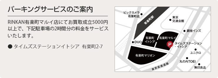 国道20号線、皇居外苑からすぐ、または国道15号線から銀座交差点を入ってもお越しいただけます。有楽町マルイのビル地下2階にタイムズステーションイトシアパーキングがあり、直結でご利用いただけます。RINKAN有楽町マルイ店にて5千円以上のお買取成約で、2時間分の駐車代をサービスいたします。
